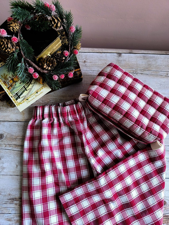 • un pantalon taille élastiquée en 4/5 ans, cousu dans une nappe à carreaux 100% coton