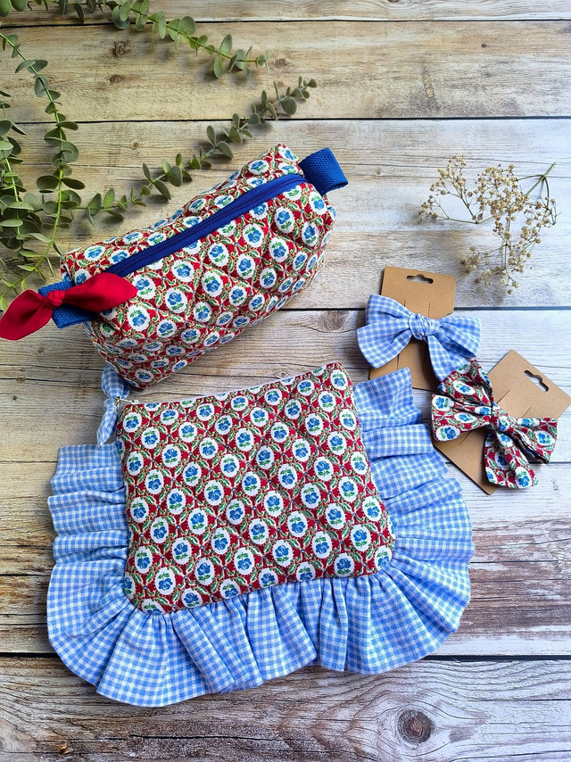 Colorée et froufroutante, Miette de Fantaisie est une pochette unique au style affirmé. Confectionnée en tissu ancien chiné et habillée d'un volant vichy bleu, elle accueille vos essentiels avec charme et originalité.
